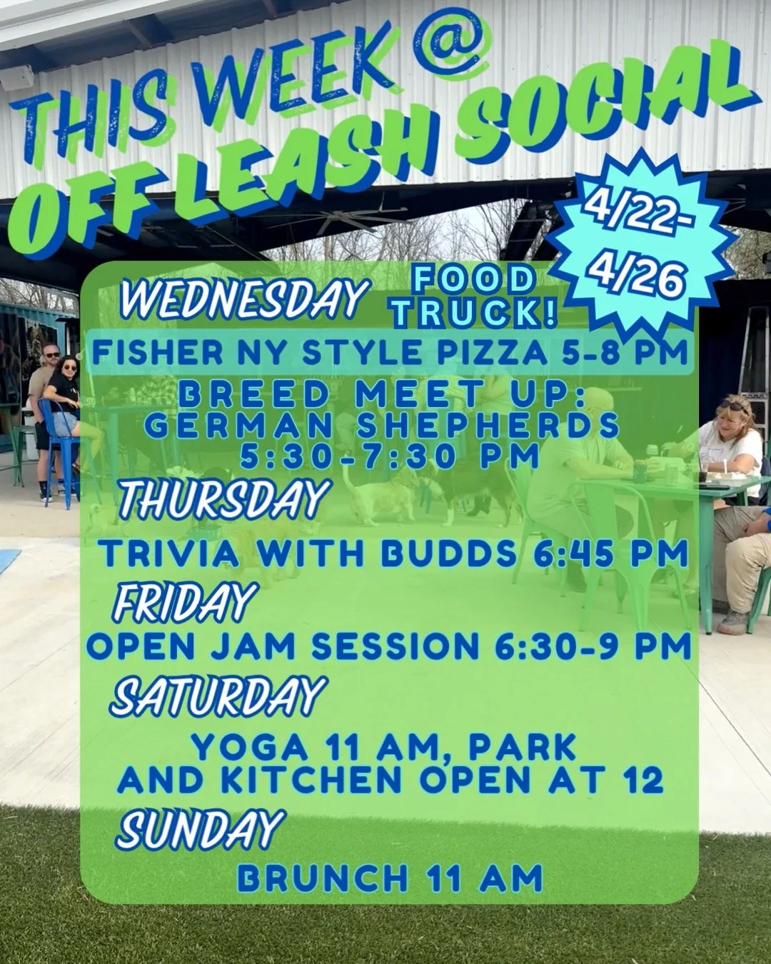 Dogs + Beer + Food + Wine + Cocktails + Soda + Live Music + Snacks + JUMBOTRON + Trivia Night + Special Events +The Kitchen + Movie Nights+ Yoga Saturdays + Karaoke nights + Game Show nights + Breed meetups + Sunday Brunch…and so much more